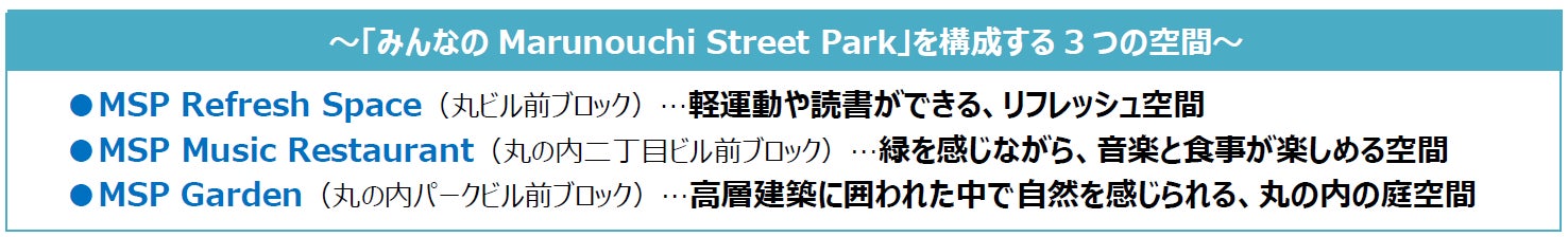 また、夏は「みんなのMarunouchi Street Park」というコンセプトを掲げ、みんなが日常的かつ自由に利用でき、誰をも受け入れる都市公園空間を作り上げます。
