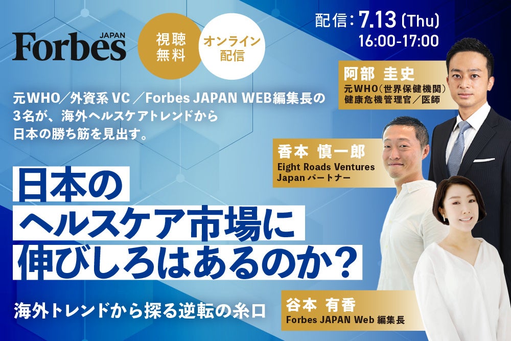 ゲストに、元WHO健康危機管理官で現役の医師でもある阿部 圭史氏、そしてEight Roads Ventures Japanにてヘルスケア及びバイオ・サイエンス・チームを率いている香本 慎一郎氏が登壇。Forbes JAPAN Web編集長・谷本 有香がモデレーターを務め、これからの日本のヘルスケアの勝ち筋をゲストと共に模索していきます。