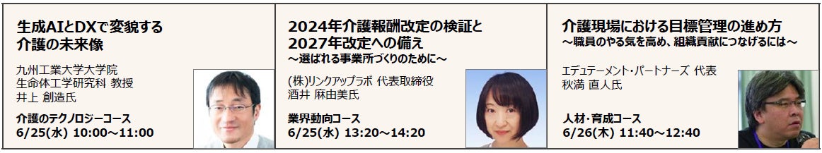 本展では、業界の第一線で活躍する専門家を講師に迎えた「専門セミナー」を同時開催する。介護のテクノロジーコースでは、九州工業大学大学院 井上創造氏が生成AIをテーマに講演。また、業界動向コースでは、(株)リンクアップラボ 酒井麻由美氏が2024年介護報酬改定の検証と次期改定の行方について解説。その他、介護現場の士気を高める目標管理、SNSを活用した採用戦略など、介護事業の課題解決に役立つセミナーがラインナップされている。受講に必要な事前申込(無料) は、公式サイトにて受付中。定員間近のセッションもあるため、早めの受講申込をおすすめする。