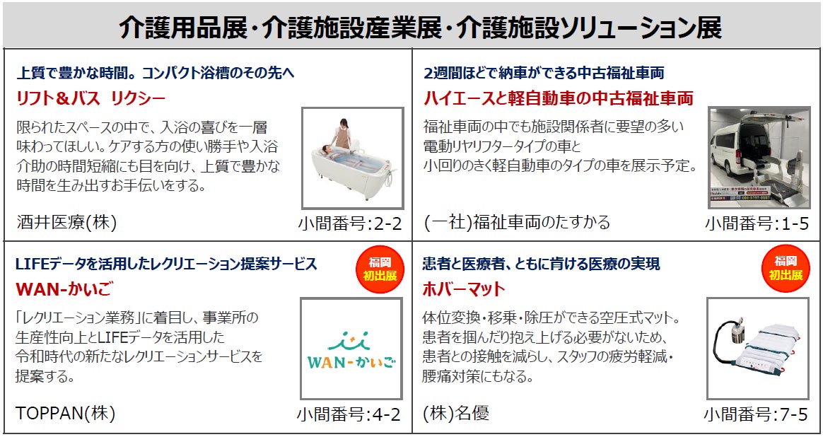 本展には介護分野の主要企業約150社が出展。最新の介護用品やリハビリ機器、介護ロボットやシステムのほか、配食・給食サービスや厨房機器など様々な商品・サービスが一堂に集結。介護事業者が商品選定や商談を目的に来場する。