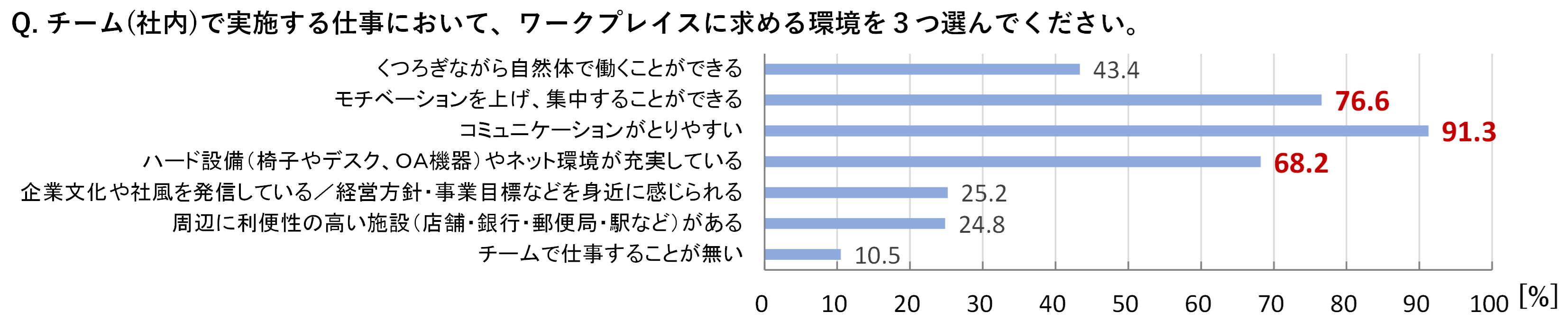 ③チームで仕事をする環境には、「コミュニケーションがとりやすい」「モチベーションを上げ、集中することができる」「ハード設備やネット環境が充実している」ことが求められている。