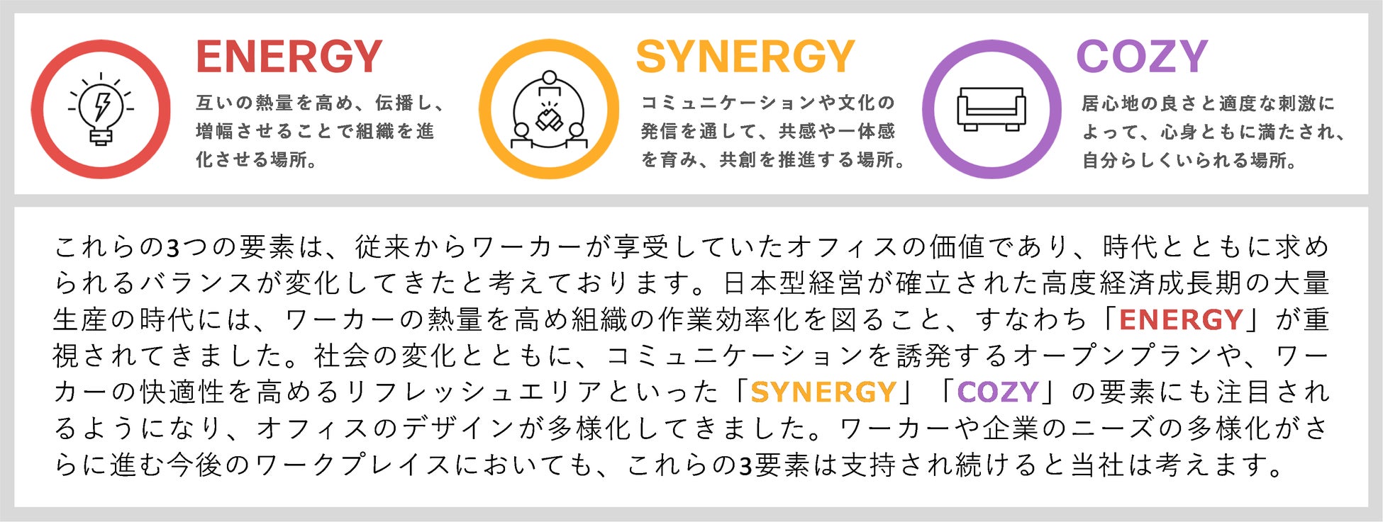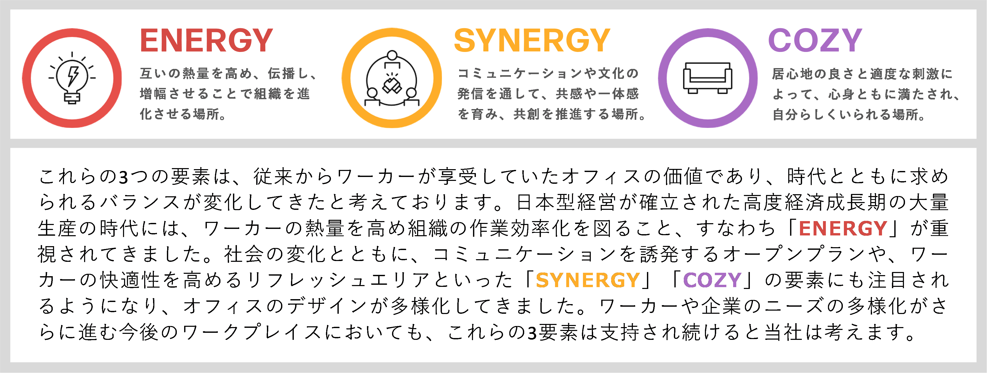 本ビジョンでは、ワーカーを惹きつけるオフィスの要素を「ENERGY」「SYNERGY」「COZY」の3つにカテゴライズしました。これらの要素を兼ね備えたオフィスを各企業のニーズに合わせて提案していくことで、ワーカー一人ひとりの目的地となるオフィスを実現します。