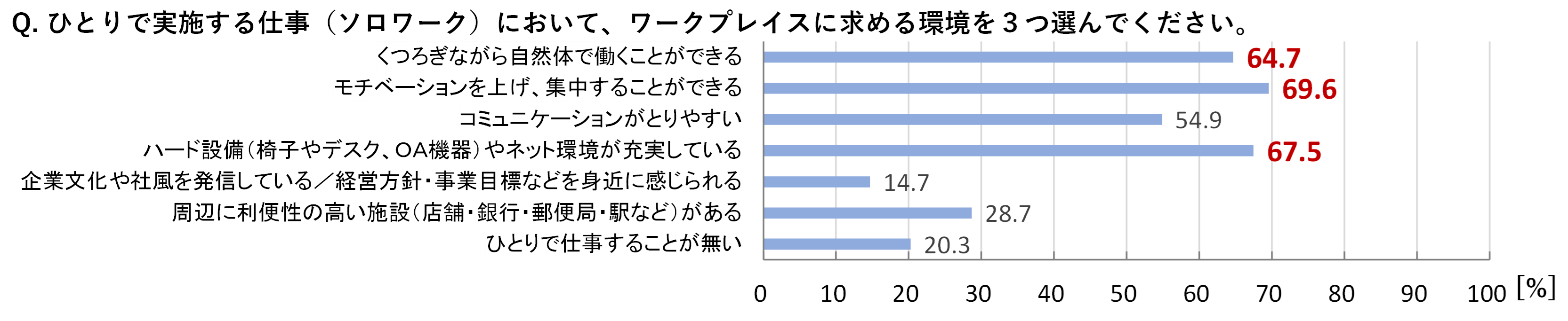 ②ひとりで仕事をする環境には、「モチベーションを上げ、集中することができる」「くつろぎながら自然体で働くことができる」「ハード設備やネット環境が充実している」ことが求められている。