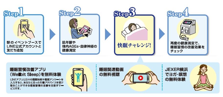 〇本実証実験では「駅からオトクに快眠チャレンジ」キャンペーンを開催し、健康測定や、睡眠習慣改善サービスの提供、ヨガや瞑想体験を実施します。またアンケートにご回答頂いた方には、協力企業の商品や協力店舗で利用できるクーポンを提供します。