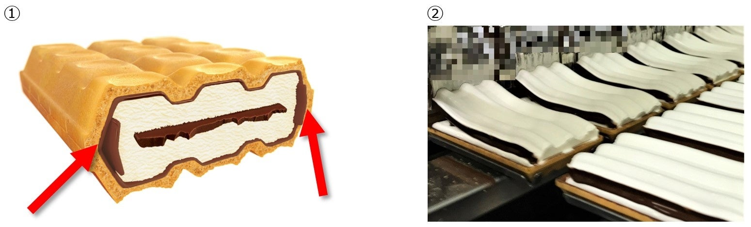②アイスの側面にはりつくチョコの品質を開発し、覆う面積を綿密に設計することで実現した、構想5年の新技術です。