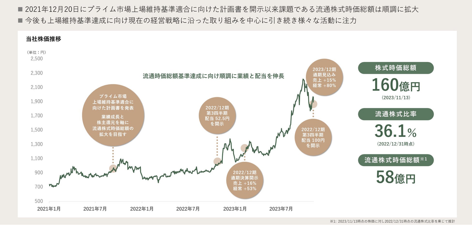 流通株式時価総額に関しまして、当社はプライム市場を選択しておりますが、現状流通株式時価総額が上場維持基準に達しておりません。2021年に基準適合に向けた計画書を提出してから、順調に業績を拡大し、流通株式時価総額も当時から約2倍となっております。プライム市場上場維持基準達成をいち早くクリアするためにも、業績成長はもちろんIR活動の充実など様々な活動に注力してまいります。