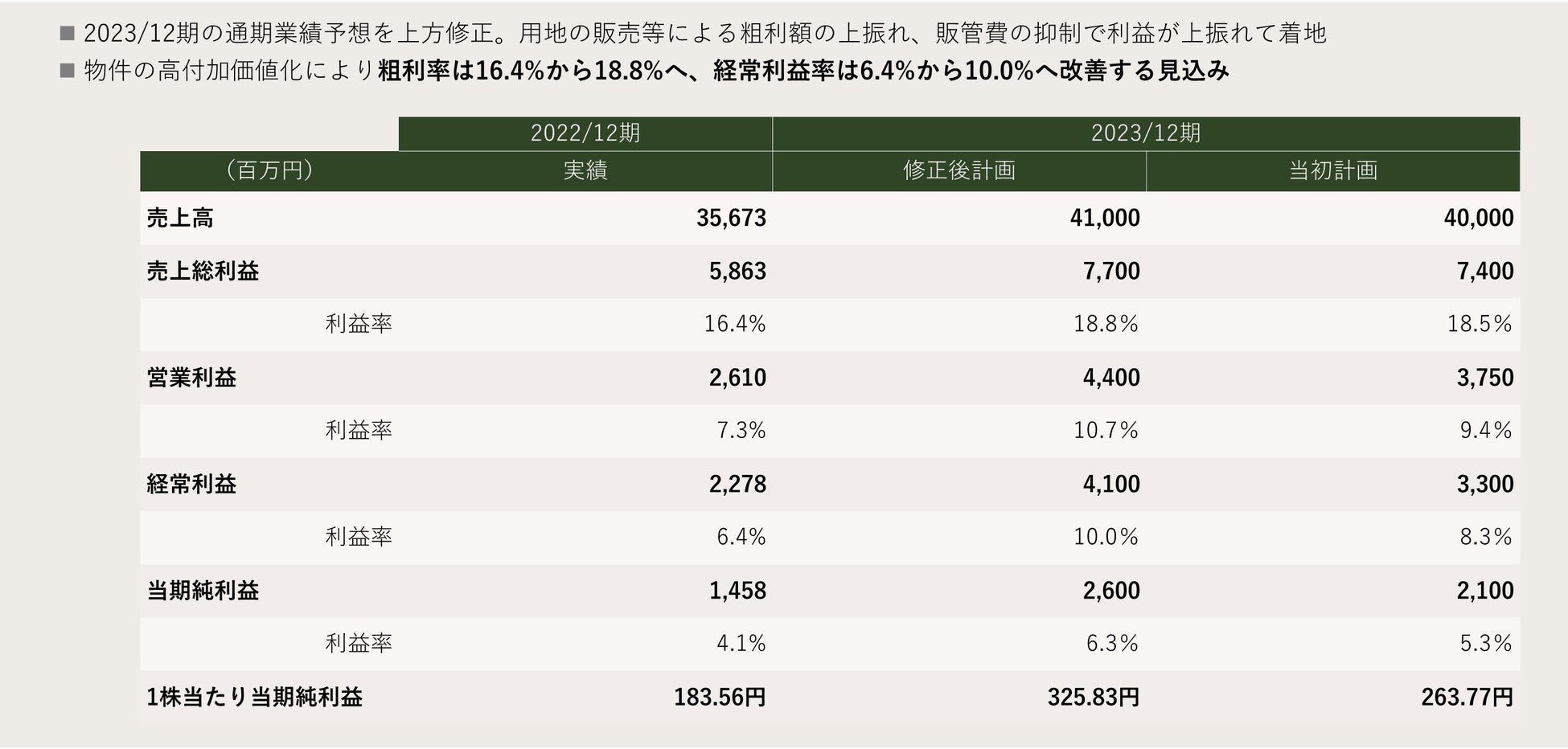 今回、第3四半期時点の物件引渡スケジュールの見直しが生じた一方で、用地の販売等による粗利額の上振れ、販管費の抑制により、売上・利益ともに、通期予想を上方修正いたしました。