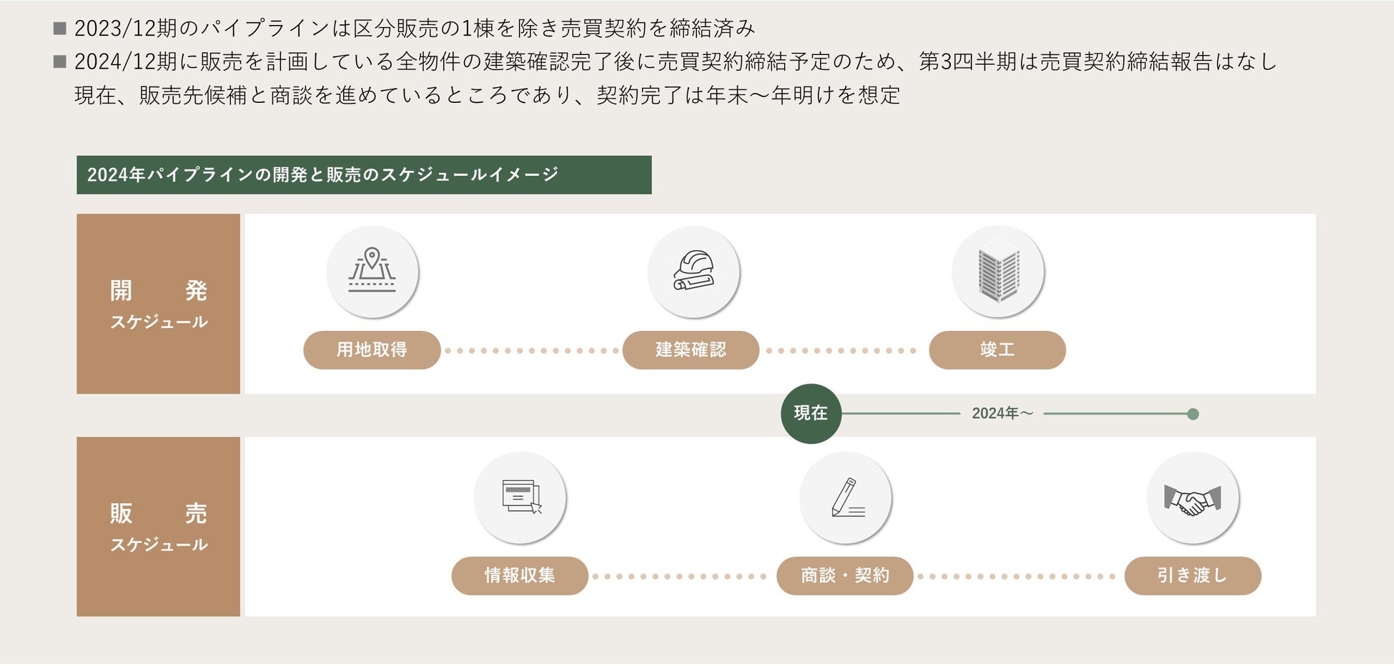 2023年12月期のパイプラインは区分販売の1棟を除き、すべて売買契約済みとなっております。2024年12月期のパイプラインについては図表のとおり、全物件の建築確認完了後に売買契約締結をおこなうため、当四半期について進捗はございません。