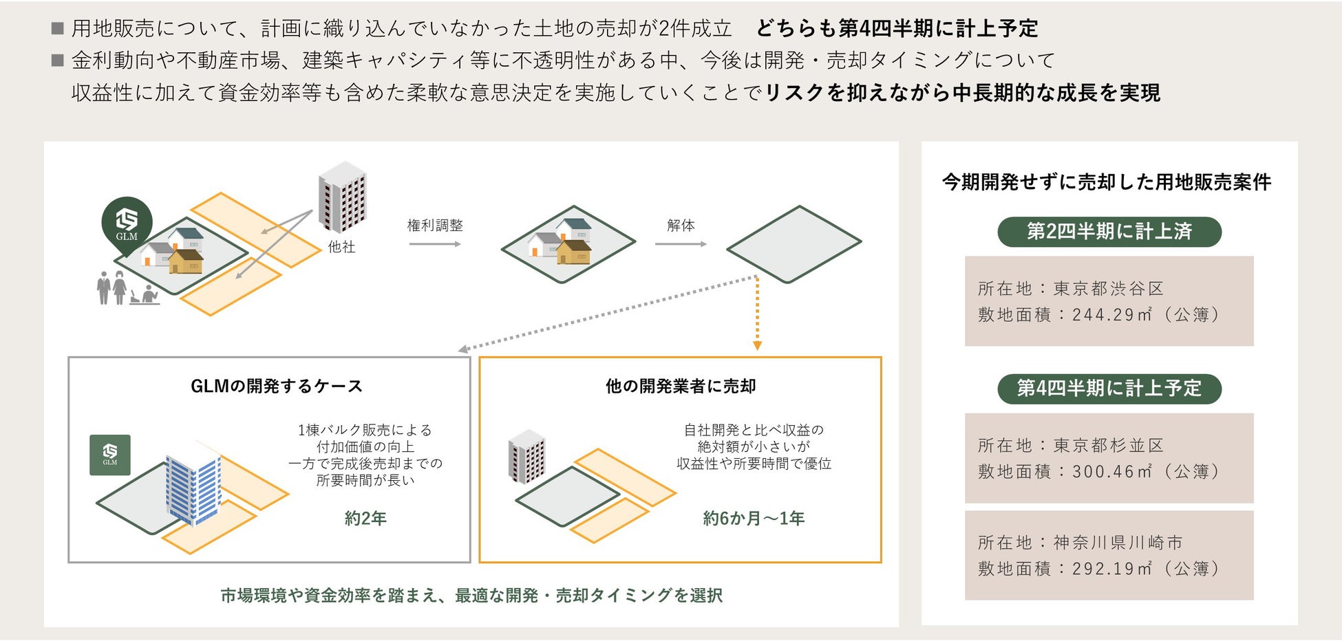 非レジデンス領域の新規事業である用地販売について、第2四半期では、期初計画では見込んでいなかった用地販売の売上計上をいたしました。第3四半期での用地販売に関する売上計上はございませんでしたが、第4四半期には既に2案件の売却に関する売買契約が完了しております。