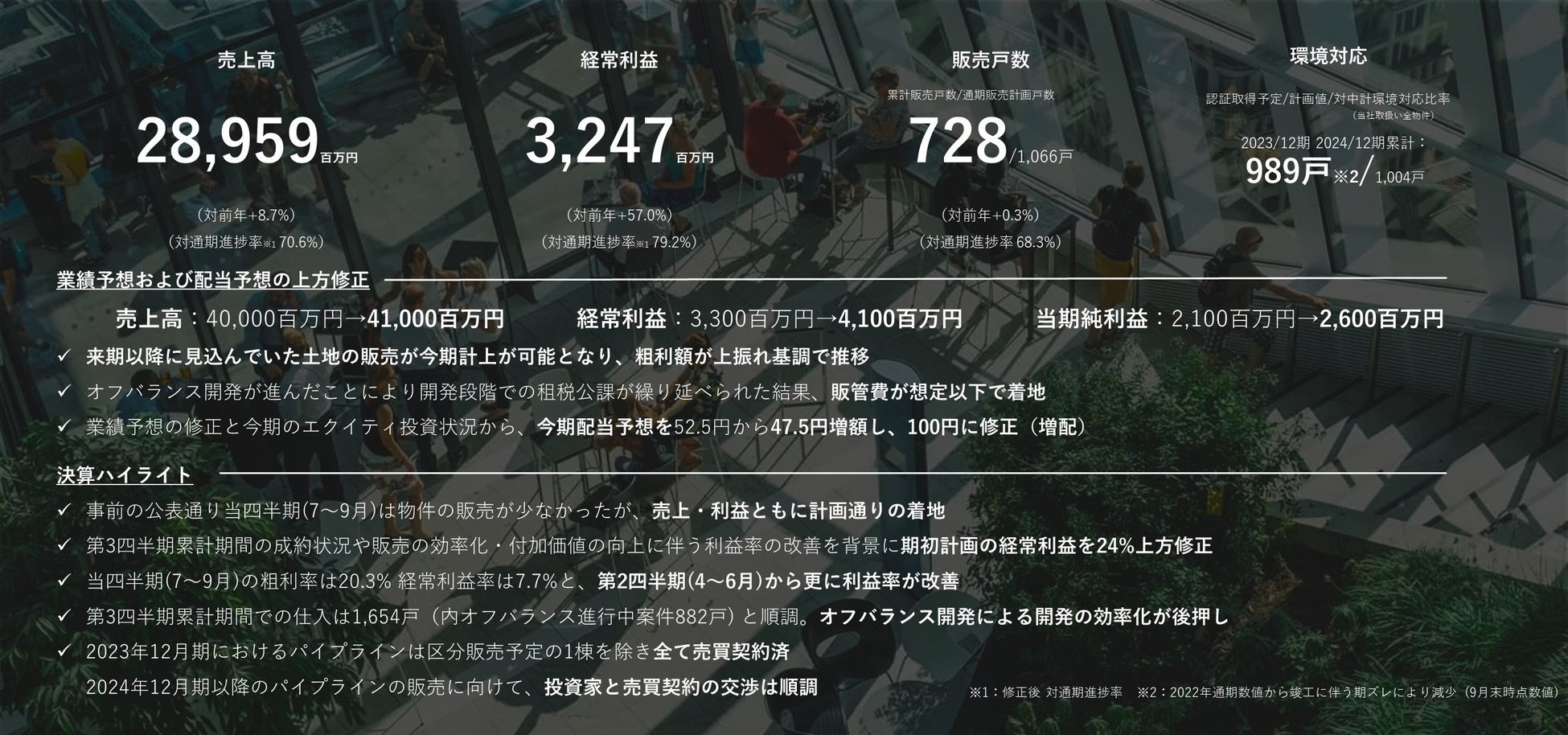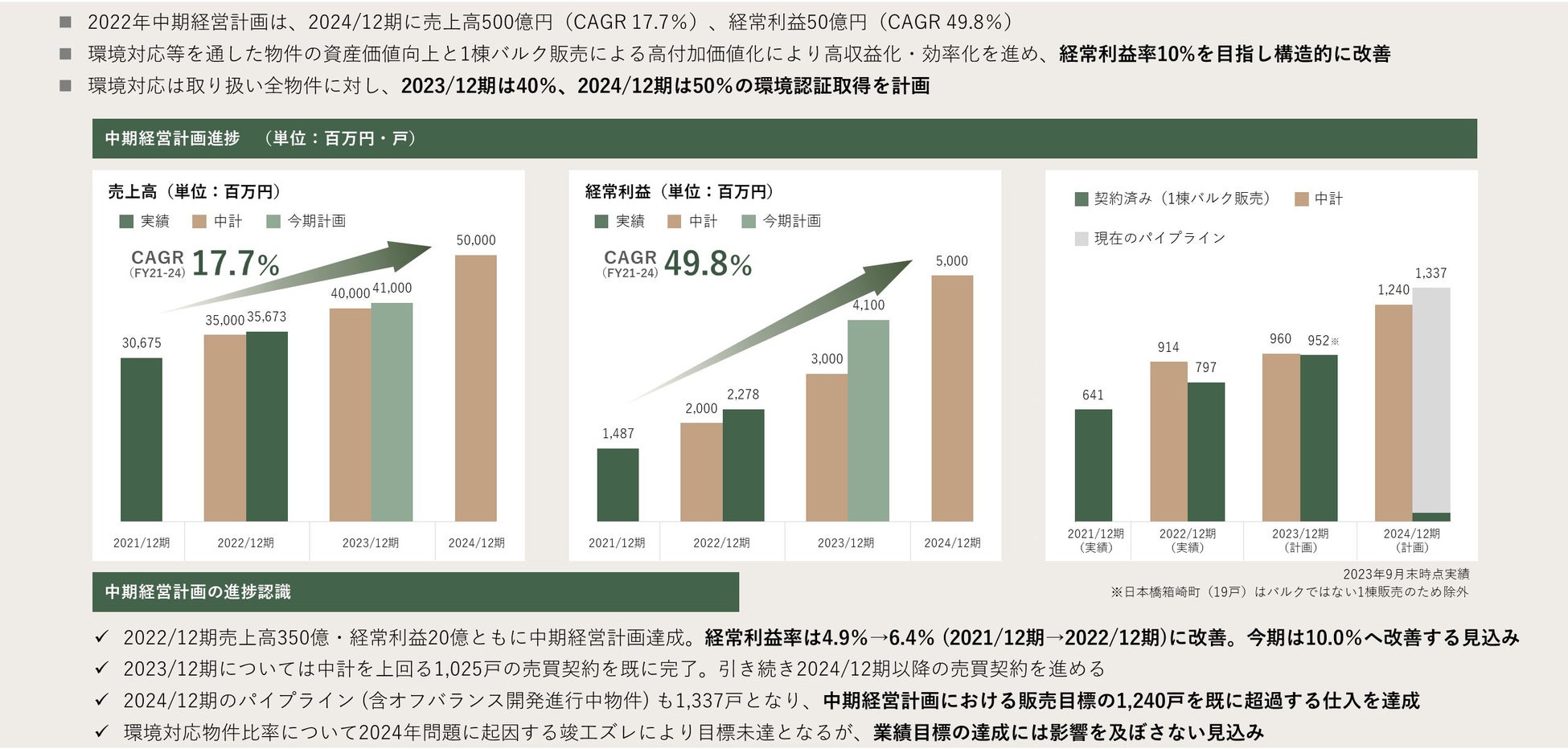 2023年は新築販売戸数を今回の業績修正に伴い修正し、993戸に修正しております。そのうち約95%にあたる952戸が1棟バルク販売により既に売買契約を完了しているため、計画通りに着地する確度は非常に高いと考えております。また、2024年12月期の仕入れは計画値である1,240戸を超過しており、仕入れ活動も順調に推移しております。