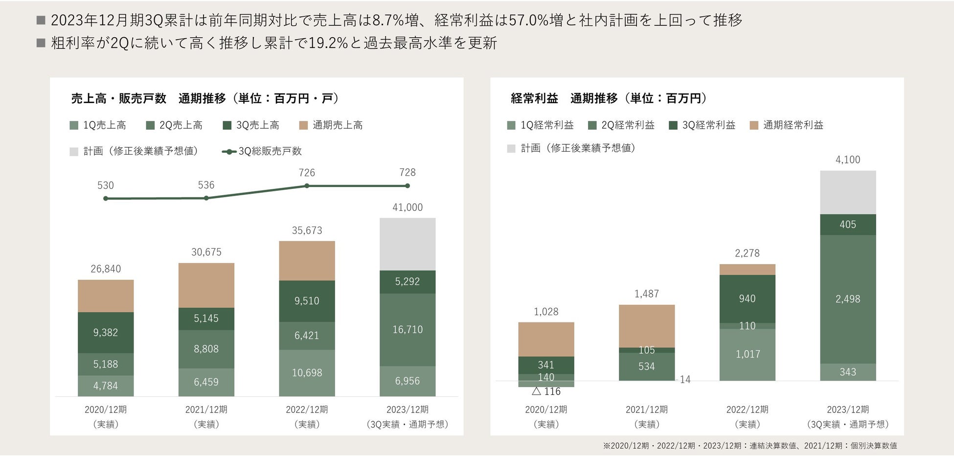 2023年12月期第3四半期の業績は、売上高289億5900万円(修正予想に対して進捗率70.6%)、経常利益32億4700万円(修正予想に対して進捗率79.2%)と、修正予想計画に対しても順調に進捗しております。