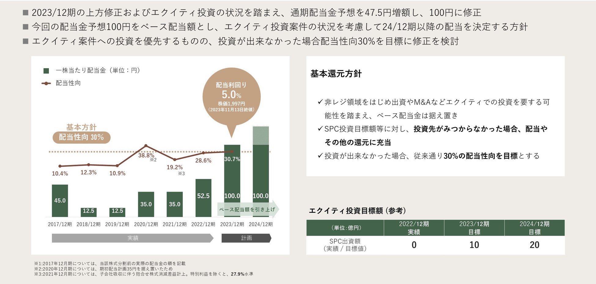 2023年12月期の上方修正およびエクイティ投資の状況を踏まえ、通期配当金予想を47.5円増額し、100円に修正しました。今回の配当金予想100円をベース配当額とし、エクイティ投資案件の状況を考慮して24/12期以降の配当を決定する方針です。エクイティ案件への投資を優先するものの、投資が出来なかった場合配当性向30%を目標に修正を検討します。