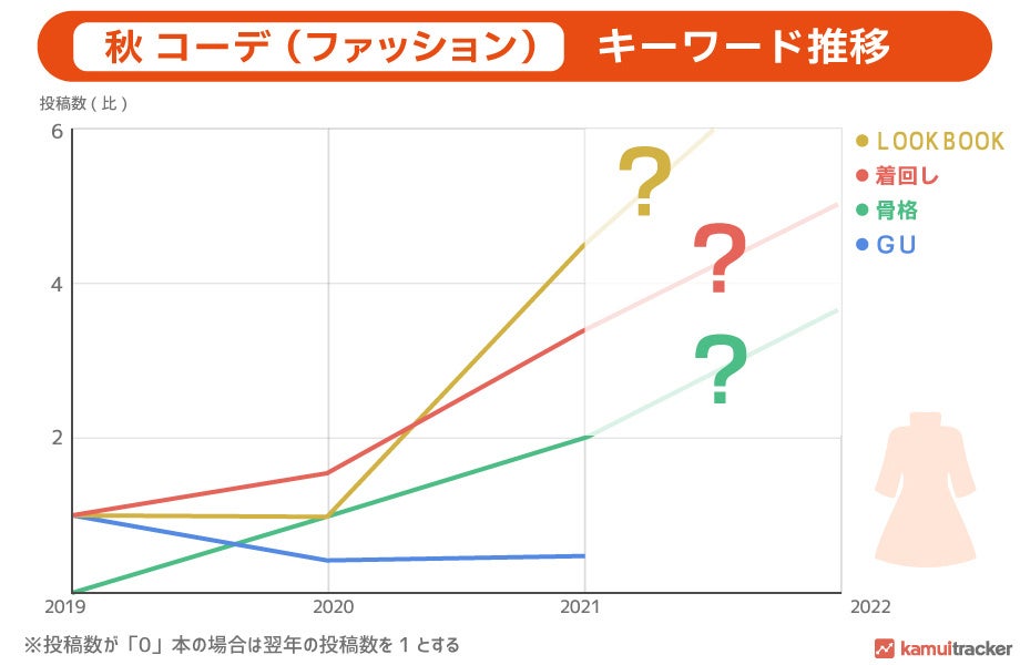 これらの事実から、「ファッション(コーデ)の秋」と「メイクの秋」にフォーカスを当てて、さらにトレンド推移の分析を実施しました。分析の結果、新型コロナウイルス発生から約2年半が経過し、コロナ前だけでなくコロナ拡大による規制が強まっていた時期と現在とでは、生活様式の変化とトレンドが密接に関係している事実が見えてきました。