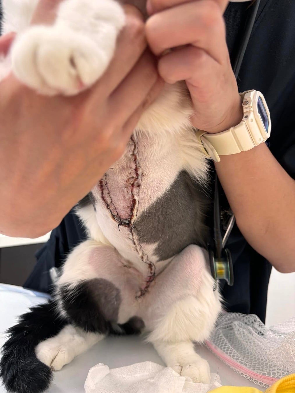 手術はひとまず成功しましたが、小さな身体のお腹に、大きな痛々しいキズができてしまいました。
