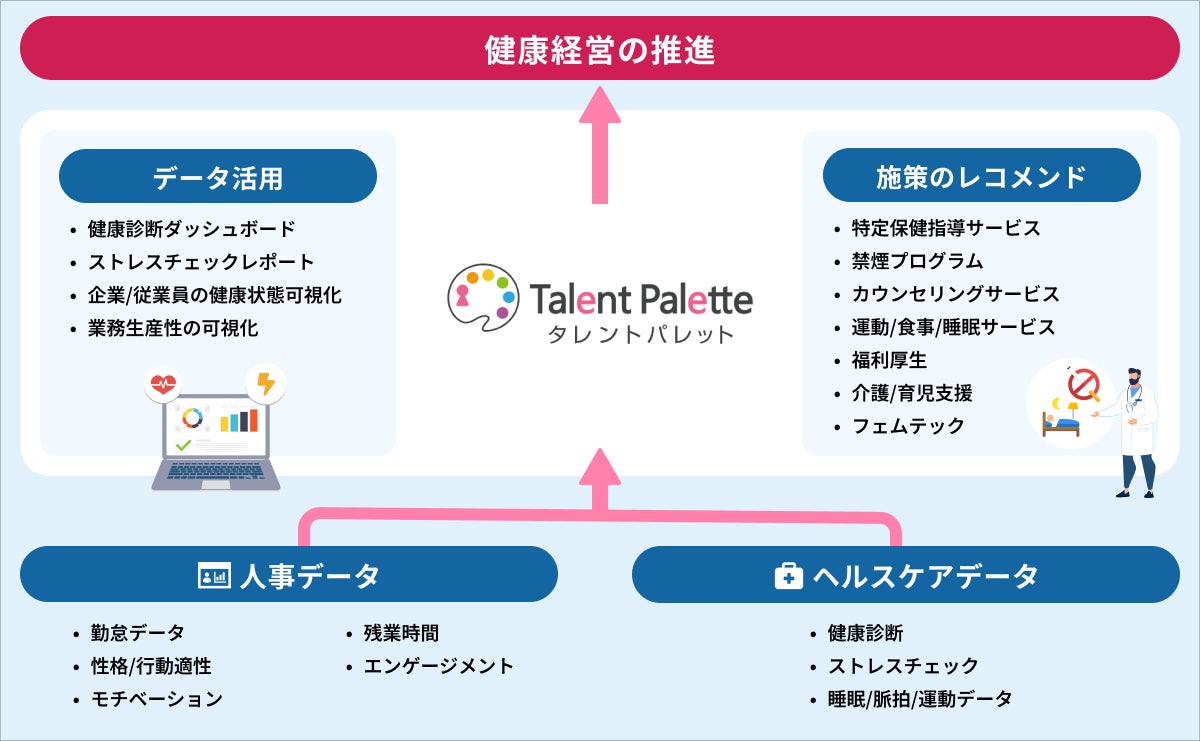 今後も収集・登録・連携できるデータを増やすとともに、従業員のフィジカルやメンタル不調に対する施策/サービスの提供ラインナップも拡張することで、あらゆる従業員・健康データを活用できるプラットフォームを目指します。タレントパレット上で従業員/健康データを掛け合わせ、フィジカルやメンタルに不調のある、あるいはその予兆がある従業員を発見、適切な施策を提供することで、従業員の健康課題を解決、企業の健康経営実現を支援します。