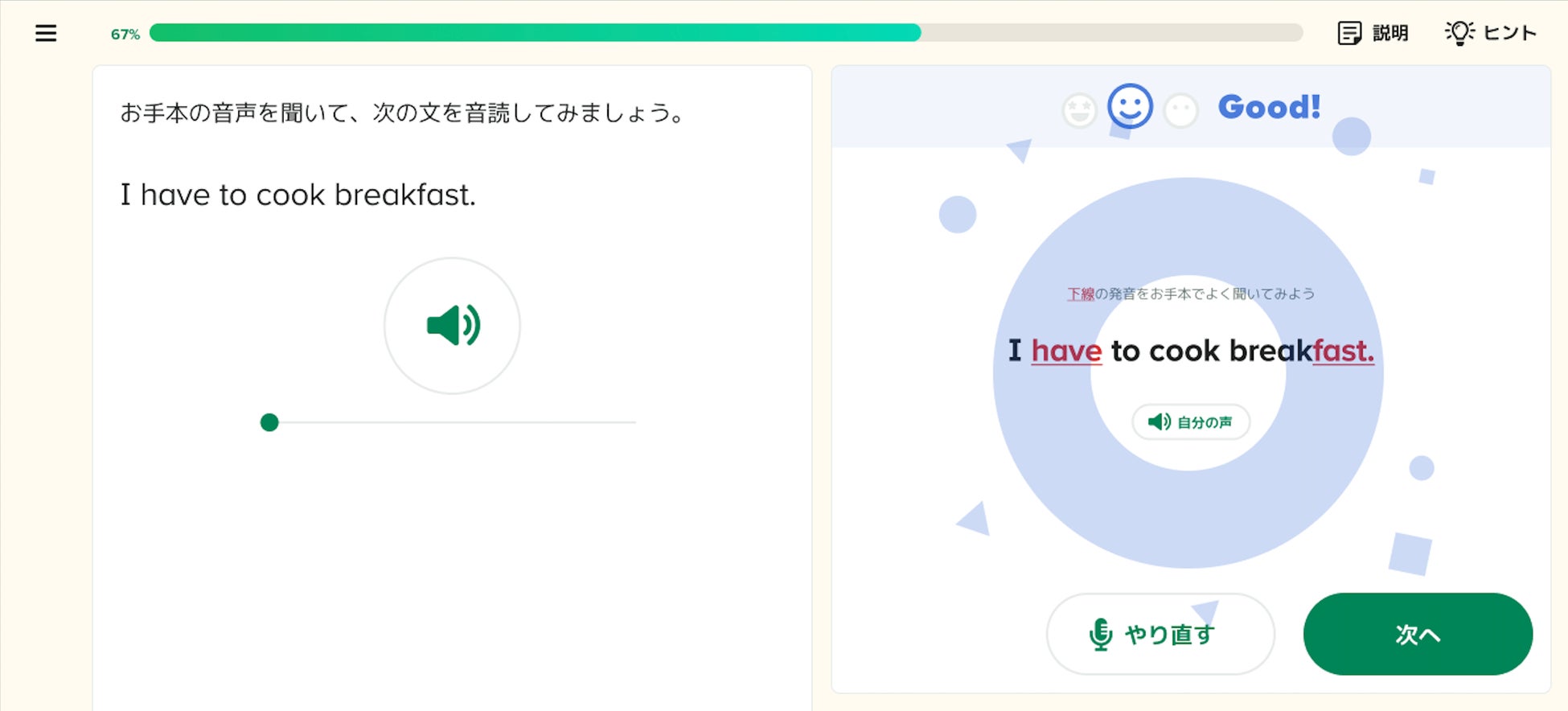 発音をAIが3段階で自動判定(Excellent / Good / Nice Try)