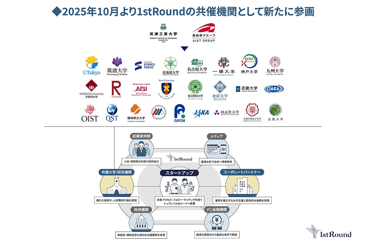 東京大学協創プラットフォーム開発株式会社(本社:東京都文京区本郷、代表取締役社長 植田浩輔、以下「東大IPC」)と21大学、4国立研究機関(※)による国内最大規模を誇るアカデミア共催の創業成長支援プログラム「1stRound」は、この度、産総研グループ(国立研究開発法人産業技術総合研究所および株式会社AIST Solutions、以下「産総研グループ」)、学校法人芝浦工業大学が新たに参画することを発表します。