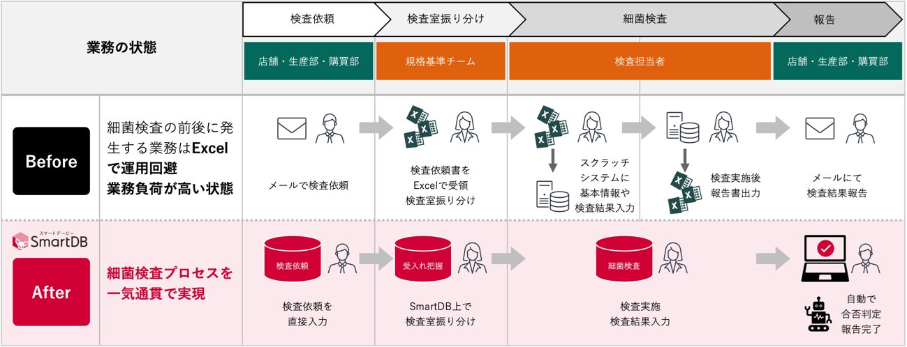 同社では、すべての商品を安全・安心にお客さまに提供するために厳しい衛生管理をおこなっています。 取引先の検査から、原材料、加工途中、完成したメニューまで、それぞれに細菌・残留農薬・アレルギーなど検査項目を設け衛生面での品質を管理。 約170種類の検査基準で、外食業界トップクラスの検体数である年間約10万件の検査を徹底的に実施しています。 品質管理において重要な細菌検査の業務プロセスを一元管理する基盤としてSmartDB(R)の採用を決定。 2024年1月より利用開始しました。