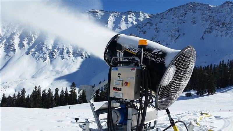 人工降雪機とは、低温の大気中に水を噴霧することで人工的に雪を作り、積雪を生じさせるための装置。大きく分けて、圧縮空気の噴射で散雪を行うガンタイプ、大型のファンを用いるファンタイプがあります。