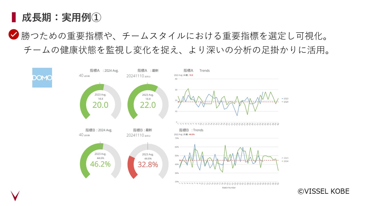 2024年は選手のコンディションやパフォーマンスなど多岐にわたる分野でDomoをフル活用し、データ活用の「成長期」となりました。データの役割、定量と定性のバランス、データの効果的な見せ方など、データ活用が洗練されることで、組織改革が一気に推進され、連覇を手繰り寄せました。