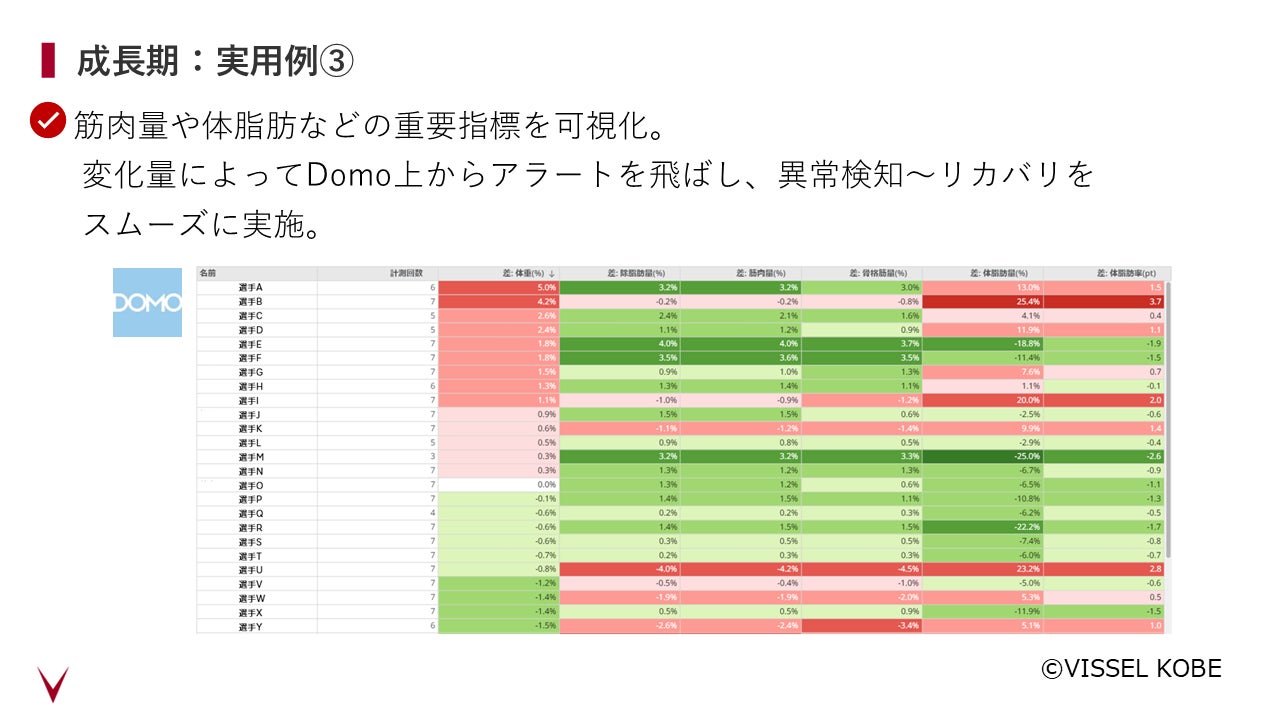 実用例3:筋肉量や体脂肪などの重要指標を選手ごとにDomoでモニタリングをしています。異常値が検出された場合はDomoのアラート機能によって、自動的に通知されます。これにより、選手の状態の急な変化を見逃すことなく、タイムリーなリカバリーができています。