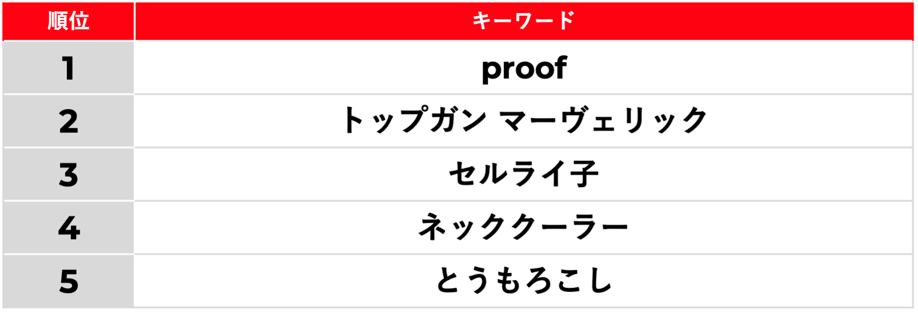 3位は「セルライ子」。全身のセルライトを刺激する棒状のマッサージ器具「セルライ子」は前月でもTOP5にランクインしていました。4位は「ネッククーラー」、6月における真夏日の多さを反映していると考えられます。そして、5位には、6月から9月にかけて旬をむかえる「とうもろこし」がランクインしました。