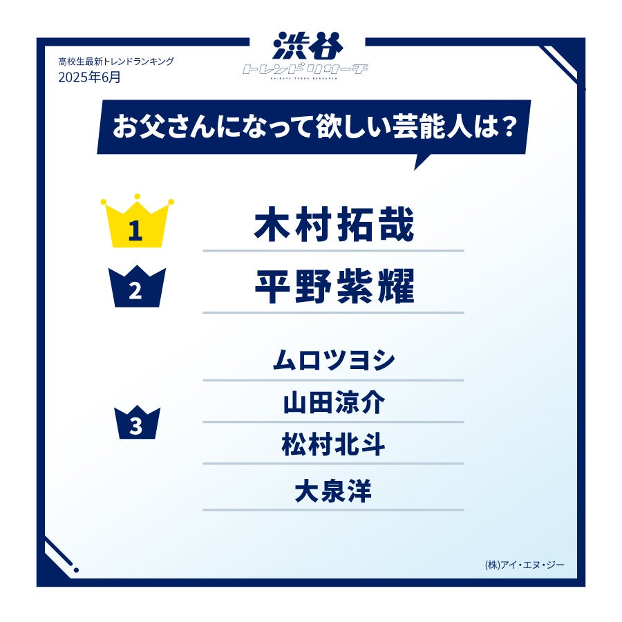 堂々の1位は「木村拓哉」が初のランクイン。「実際の2人の娘さんが幸せそうだし、木村拓哉がお父さんとか絶対最高」(高2・女子)や「Kokiちゃんが良い子に育ってるから」(高1・女子)など、芸能活動をしている娘の「koki」の父親として憧れる高校生も多いようです。続いて2位には「平野紫耀」が選ばれました。「イケメンなのにちょっと天然で面白そう」(高1・女子)といったコメントから、“かっこいいのに親しみやすい”イメージが支持を集めました。3位はなんと「ムロツヨシ」「山田涼介」「松村北斗」「大泉洋」の4名が同率でランクイン。プライベートで父親として知られるメンバーだけでなく、映画やドラマで父親役を演じたイメージも注目されるポイントのようです。