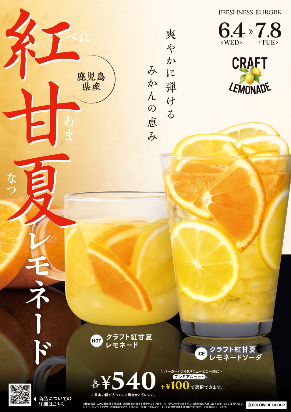 コロワイドグループの株式会社フレッシュネス(代表取締役社長:齋藤 健太朗/本社:神奈川県横浜市西区)は、2025年6月4日(水)より、ハンバーガーチェーン「フレッシュネスバーガー」にて、クラフトレモネードシリーズから、鹿児島県産の紅甘夏を(べにあまなつ)使用した「クラフト紅甘夏レモネードソーダ(ICE)」「クラフト紅甘夏レモネード(HOT)」と、揚げたて提供が大好評の北海道産フライドポテトの新フレーバー「ディップポテト きざみわさびタルタル」を期間限定発売いたします。