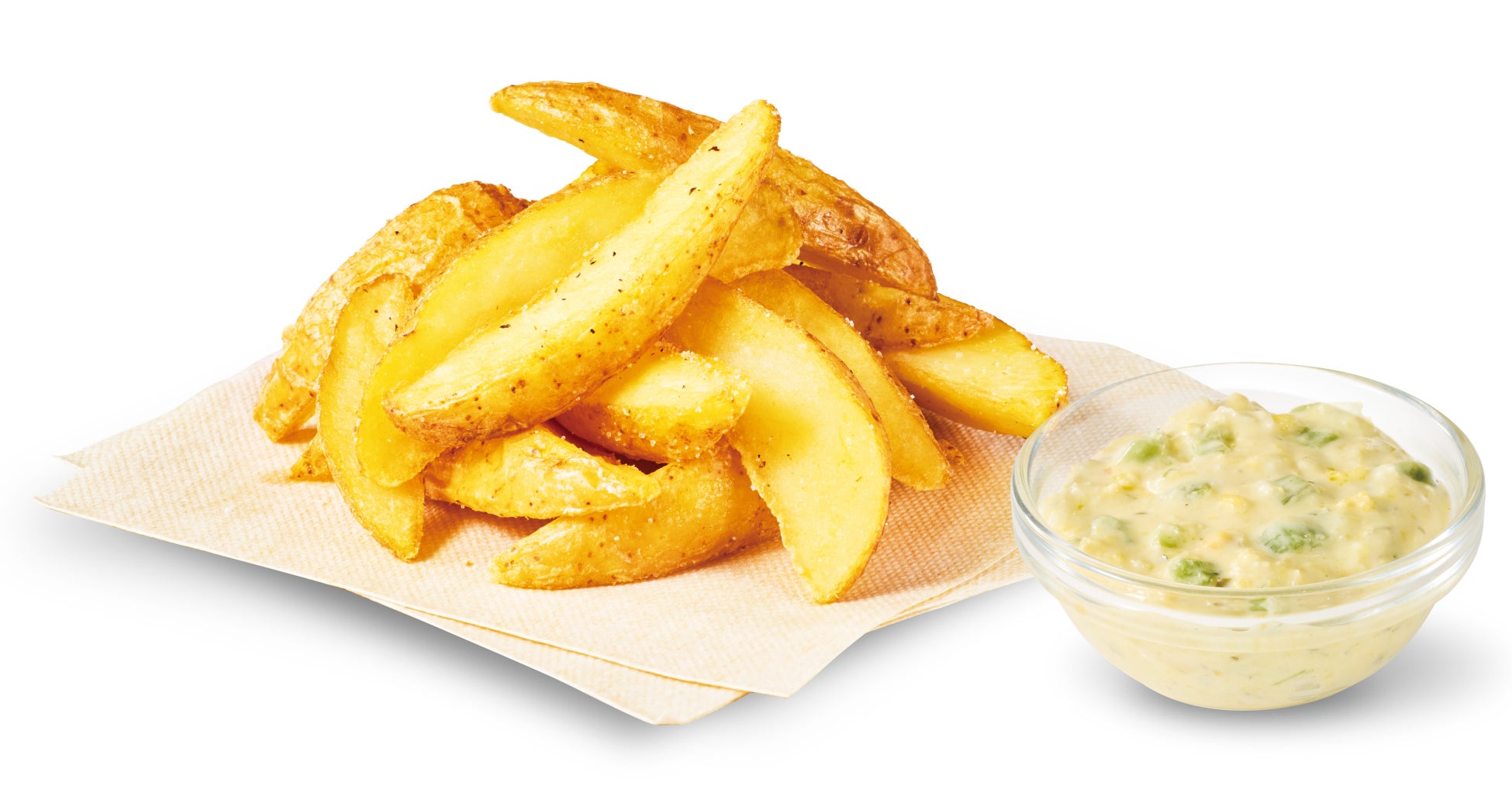 注文を受けてから作る揚げたてアツアツの北海道十勝産「北海こがね」の皮付きフライドポテトに、本わさび茎のシャキシャキ食感とツンとした辛みが特徴のきざみわさび、コクのあるクリーミーな自家製タルタルソースを合わせたディップソースをたっぷりと付けてお召し上がりください。
