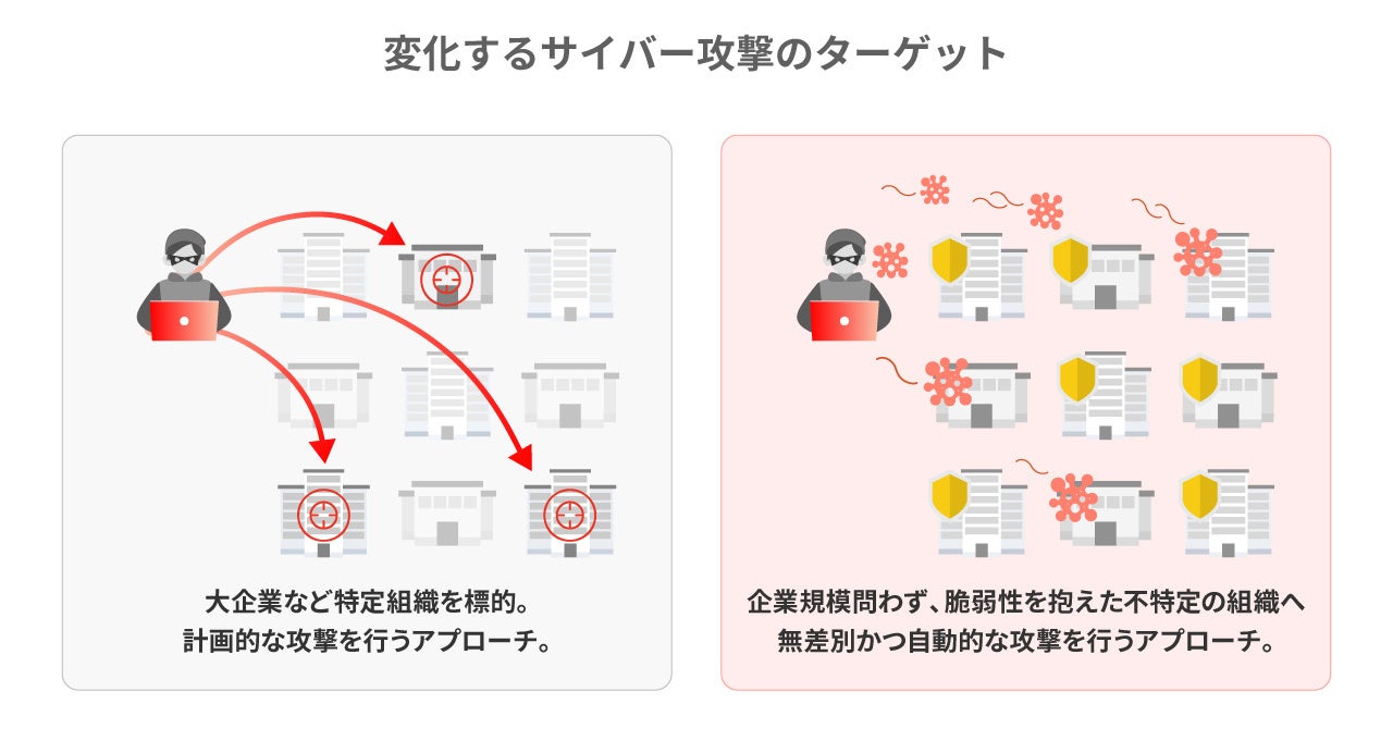 近年のサイバー攻撃は脆弱性を抱えた不特定の組織へ無差別かつ自動的に攻撃するようになってきています。特定の企業に標的を絞って計画的に攻撃を仕掛るよりも、このほうがはるかに効率的だからです。また近年は特にIoT化・自動化などにより多くのシステムがネットワークに接続されるようになってきています。ネットワークに繋がるシステムが増えれば増えるほど、これに比例して当然脆弱性も増えます。これもまた、近年のサイバー攻撃被害件数増加の要因の一つとされています。