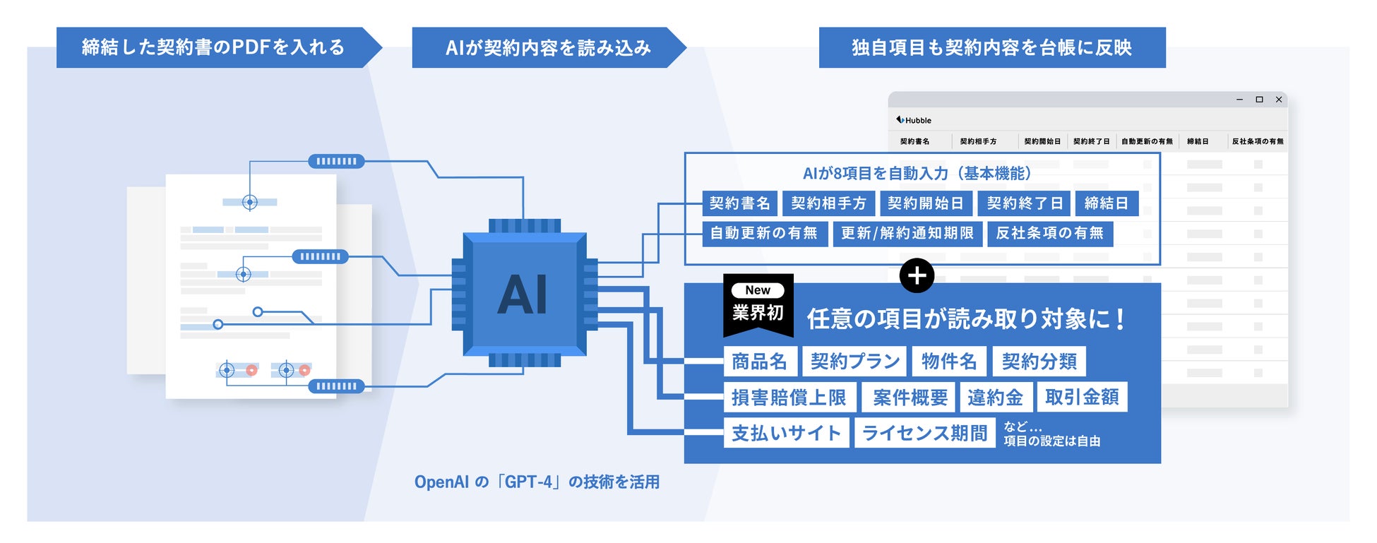 ユーザーが指定した項目に該当する情報をAI(OpenAI社の最先端AI技術「GPT-4」)が自動で読み取り・抽出し、Hubbleの契約台帳に反映する機能です。