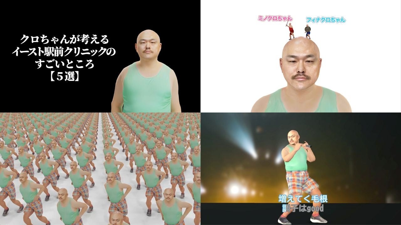イースト駅前クリニック様(https://www.eastcl.com/aga/)の動画広告にて、クロちゃんの3Dアバターを起用いただき、クリエイティブを制作いたしました。