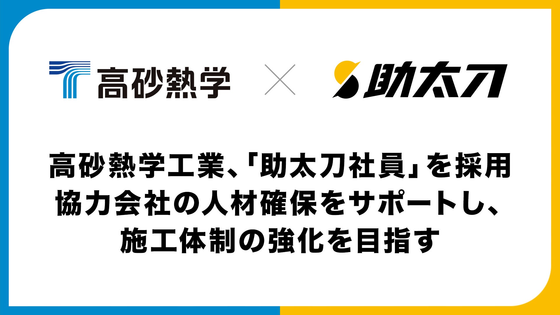 建設業界に従事する全ての人たちを支えるマッチングプラットフォーム「助太刀」を運営する株式会社助太刀(所在地:東京都新宿区、 代表取締役社長 兼CEO:我妻陽一 以下 「当社」)は、当社が提供する建設業特化の求人サービス「助太刀社員」が、空調設備工事国内大手である高砂熱学工業株式会社(所在地:東京都新宿区 、代表取締役社長:小島和人 以下「高砂熱学」)に採用されたことをお知らせいたします。