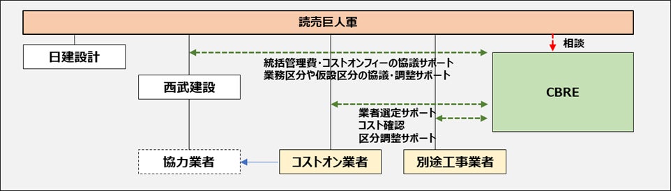 本プロジェクトを統括した読売巨人軍の担当者は、「CBREがコンストラクションマネージャーとして参画したことで、本体工事、コストオン工事、別途工事を効率的に分け、予想以上のコスト削減が実現されました。工期中の工程管理や関係者との調整が適切に行われ、建設に不慣れな我々にとって心強いパートナーとなりました。プロ野球チームの運営を考慮したスタジアム建設という専門性の高い事業でありながら、読売巨人軍の意図や要望を理解いただき、スムーズにスタジアム建設を進めることができました。CBREの参画は、実施設計終了後でしたが、早期の参画であれば、さらに大きなメリットと安心感を得られたと考えております」と述べています。