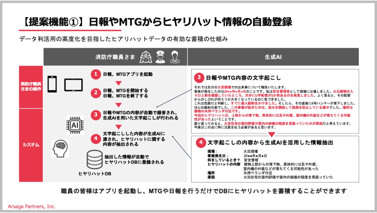 1つ目の機能は、日報やミーティングのデータからヒヤリハット情報を自動的に抽出するシステムの導入に関するものです。このシステムでは、日報やミーティング内容を文字起こしをし、その内容からヒヤリハットに該当する情報をAIが自動で抽出します。