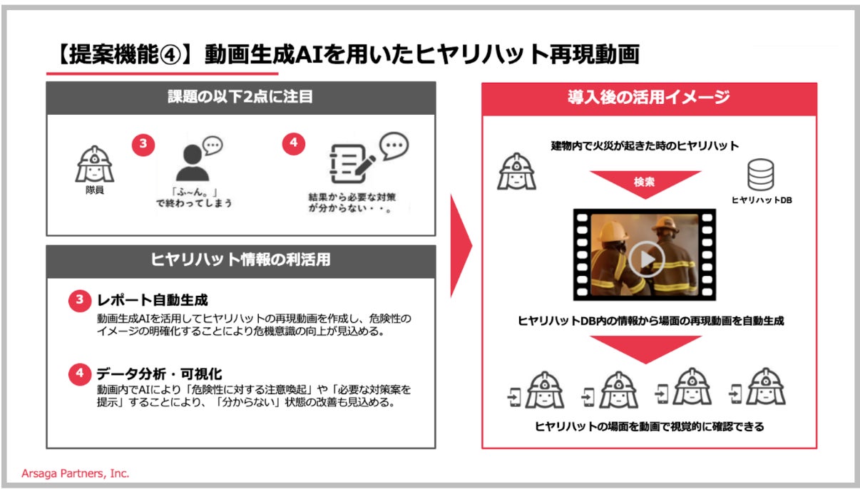 4つ目の機能は、頻繁に発生するヒヤリハット事例に関する情報を多くの隊員に周知するためのシステムです。蓄積されたヒヤリハットデータベースを基に、動画生成AIを活用して、危険性に関する注意喚起や必要な対策案を提示します。