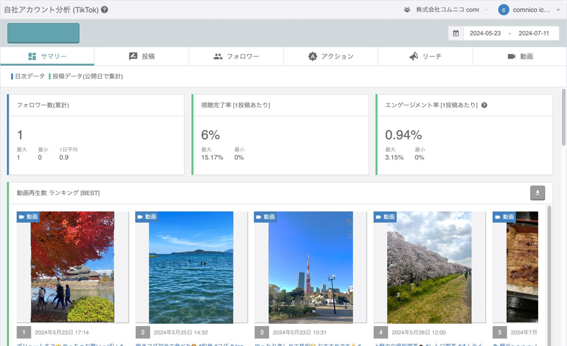 株式会社ラバブルマーケティンググループ(本社:東京都港区、代表取締役社長:林 雅之、証券コード:9254)の子会社で、企業のSNSマーケティングを支援する株式会社コムニコ(本社:東京都港区、代表取締役:長谷川 直紀、以下「コムニコ」)は、コムニコで開発・提供をしているSNS運用効率化ツール「comnico Marketing Suite(コムニコ マーケティングスイート)」に、TikTokの自社アカウント分析機能を追加いたしました。これにより、TikTokアカウントのフォロワー数、動画再生数、「いいね」数などの基本的な指標や、投稿ごとの詳細なパフォーマンス指標を確認することが可能になります。