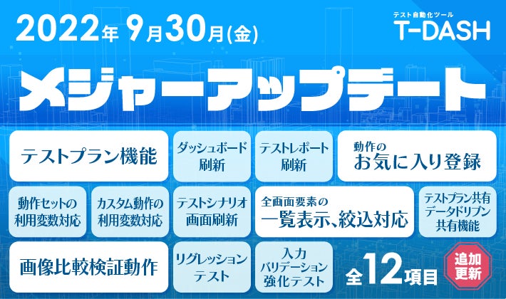 2022年2月に正式リリースをしたテスト自動化ツール「T-DASH」は、多くの開発現場での効率化や生産性向上を実現しておりますが、この度、ユーザーの皆様がよりT-DASHを活用いただけるようメジャーアップデートを行いました。