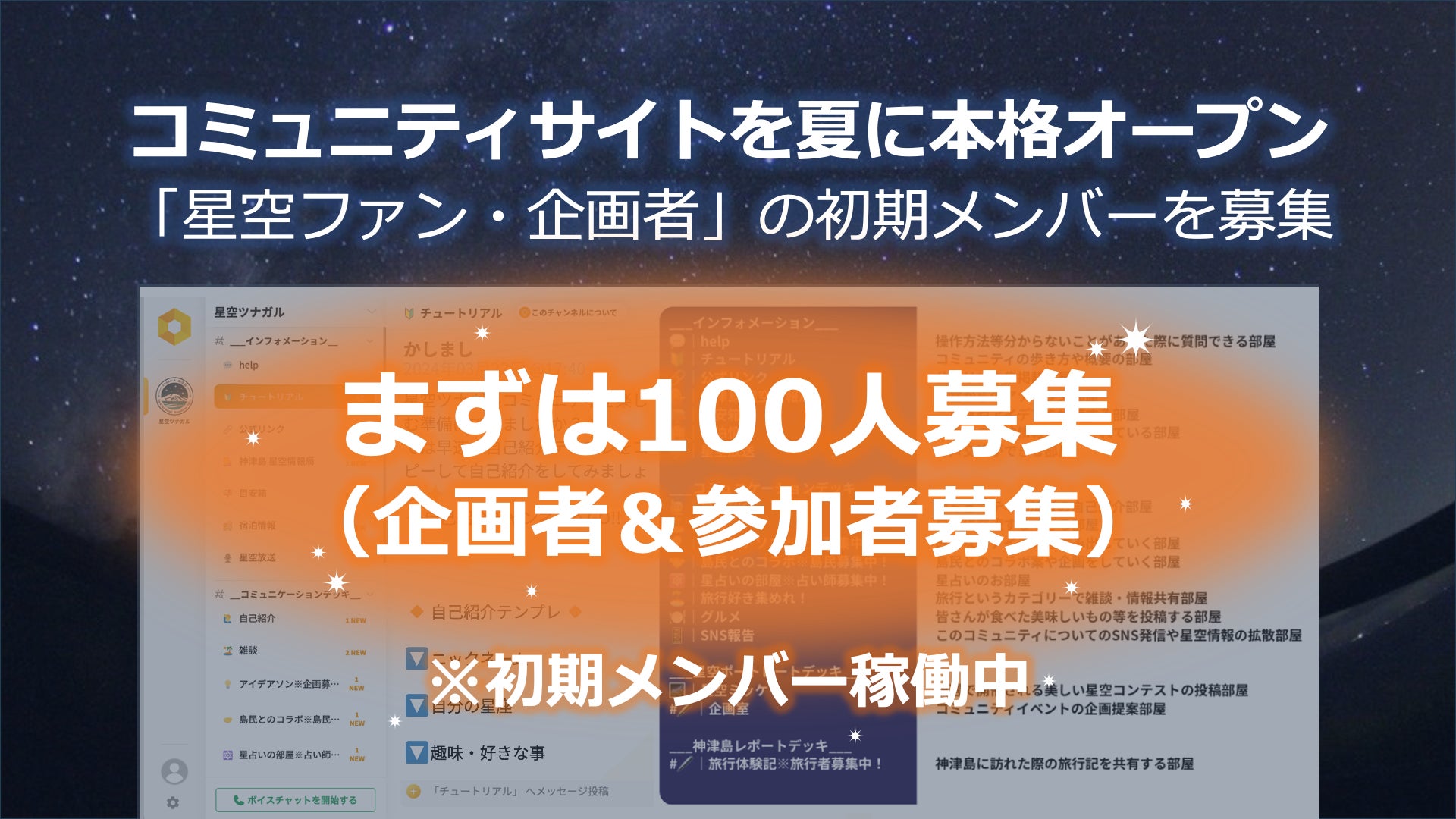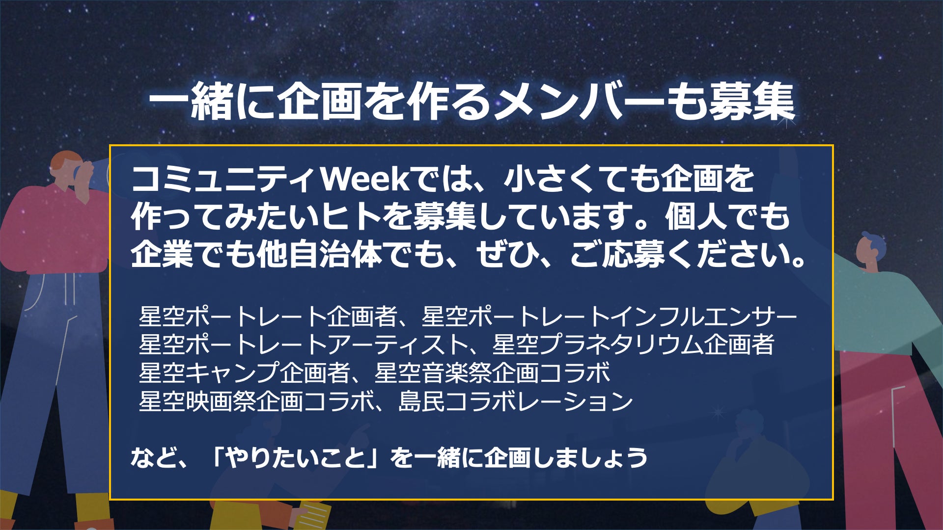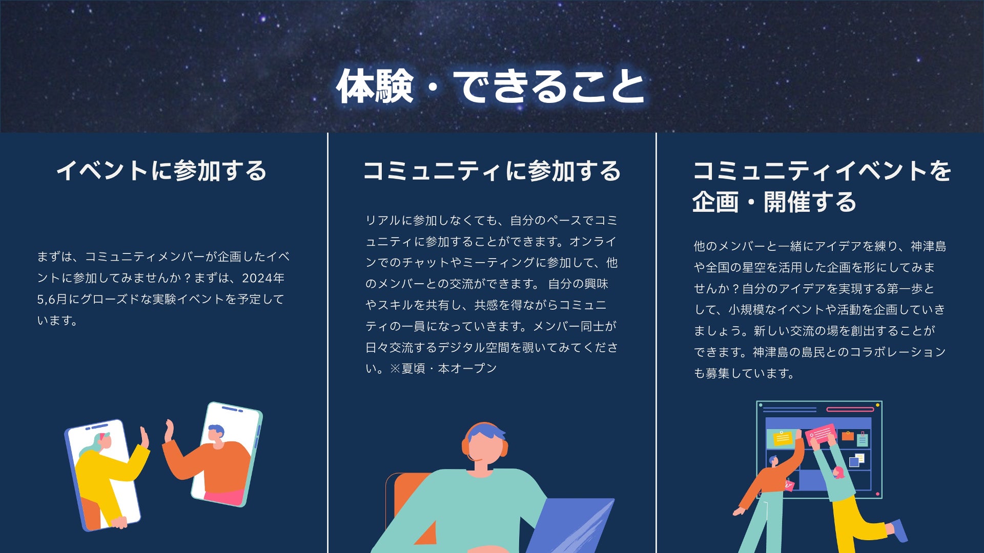日本中の星空好きとツナガルことを目指し、まずは、ちょっとでも星空好きな人たちとリアルイベントやデジタル上での交流から取り組みます。星空が好きな人・全国の星空関連の事業者・新しい体験や観光に興味がある人たち・もちろん島民とコラボレーションを生み出す共創型のコミュニティを構築していきます。具体的には、①デジタル上のコミュニティに参加する ②リアルにコミュニティイベントに参加する ③企画者としてコミュニティイベントを開催・企画する、となります。
