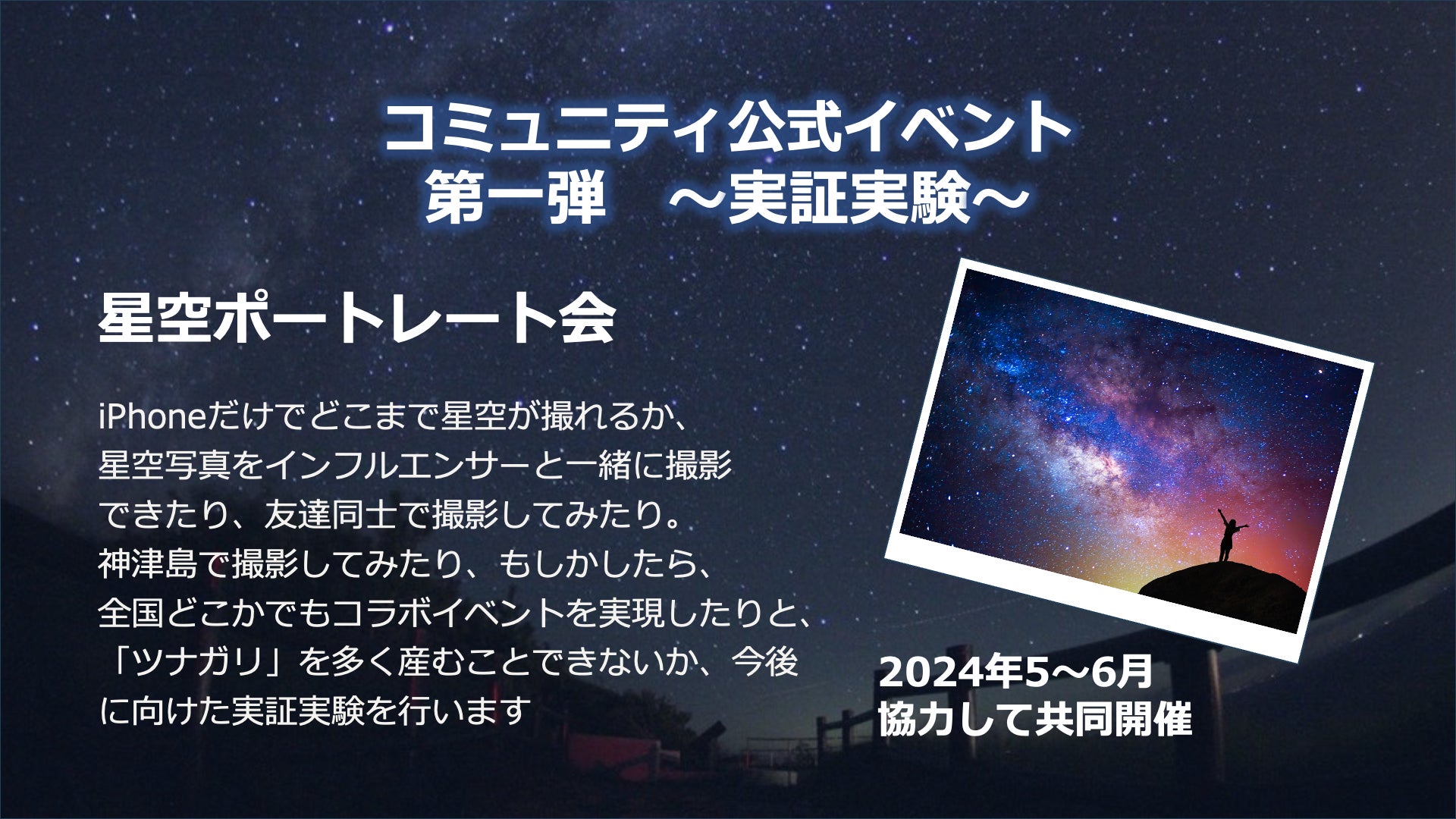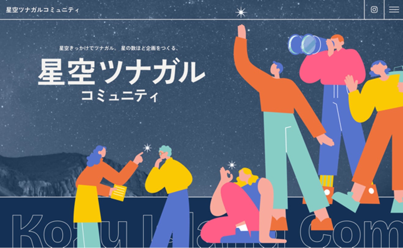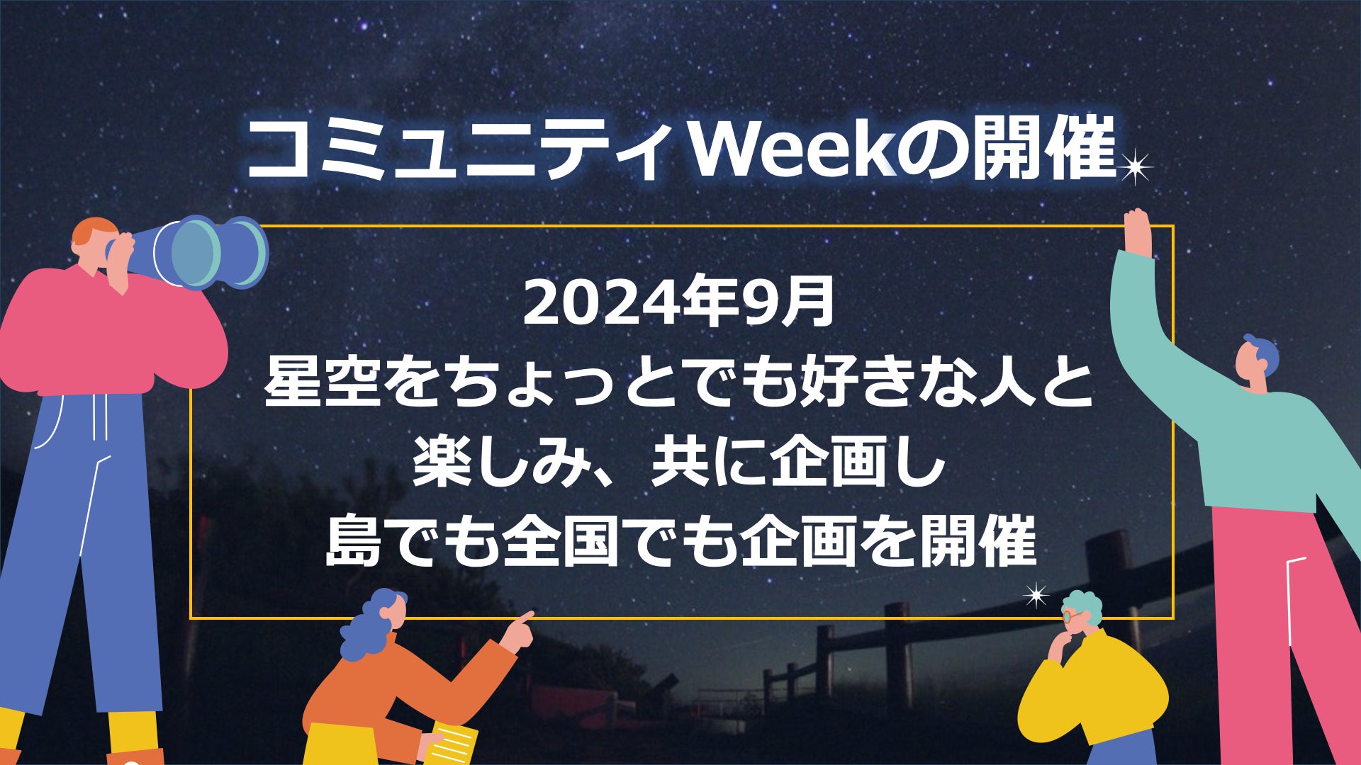 日本中の星空好きとツナガルことを目指し、まずは、ちょっとでも星空好きな人たちとリアルイベントやデジタル上での交流から取り組みます。星空が好きな人・全国の星空関連の事業者・新しい体験や観光に興味がある人たち・もちろん島民とコラボレーションを生み出す共創型のコミュニティを構築していきます。具体的には、①デジタル上のコミュニティに参加する ②リアルにコミュニティイベントに参加する ③企画者としてコミュニティイベントを開催・企画する、となります。
