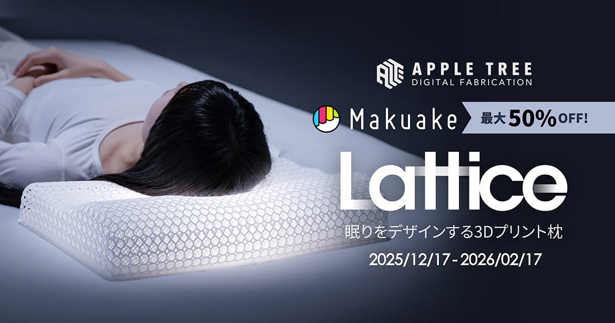APPLE TREE株式会社(本社:大阪府大阪市、代表取締役社長:朴 秀明)は、最新の光硬化方式3Dプリント技術とバイオベース素材を採用した新構造枕『Lattice(ラティス)』を、2025年12月17日よりクラウドファンディング「Makuake」にて支援受付開始いたします。