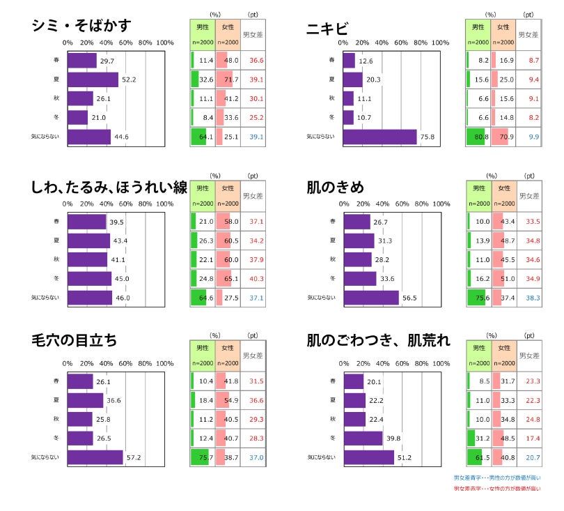 「しわ、たるみ、ほうれい線」や「肌のきめ」「毛穴の目立ち」などは、季節ごとの違いは小さく、年間通じて気にする人がいるようです。