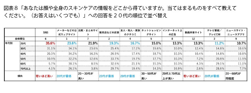 スキンケアの情報をどこから得ているかを聞くと(図表7)、最も割合が高いのは「メーカーなどの公式ウェブサイト」(30.8%)でした。