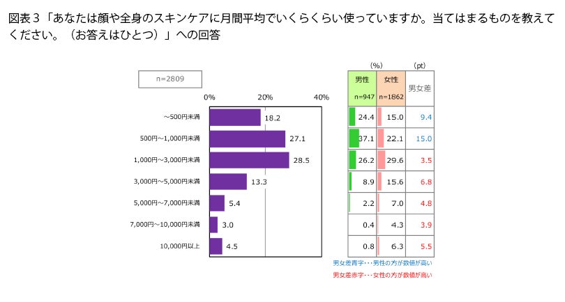 月間平均でスキンケアに使う費用を聞くと(図表3)、「〜500円未満」が18.2%、「500円〜1,000円未満」が27.1%、「1,000円〜3,000未満」が28.5%でした。3,000円未満の人を合計すると、73.8%です。「3,000円〜5,000円未満」の人が13.3%なので、そこまで合計すると、87.1%と、9割近くになります。