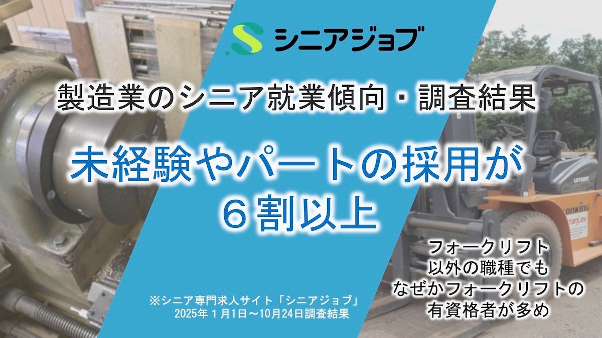 シニア転職支援の株式会社シニアジョブ(本社:東京都新宿区/代表取締役 中島康恵)は、運営するシニア専門求人サイト「シニアジョブ」において2025年1月1日から10月24日までの期間に製造業の職種に就業した求職者の傾向調査を行いました。雇用形態がパート・アルバイトであったシニア、応募業務について未経験だったシニアがいずれも60.9%と多く、柔軟な働き方と幅広い対象が歓迎される傾向が見られました。また、フォークリフトの仕事以外に就業したシニアでも、フォークリフトの資格保有者が多い傾向がありました。
