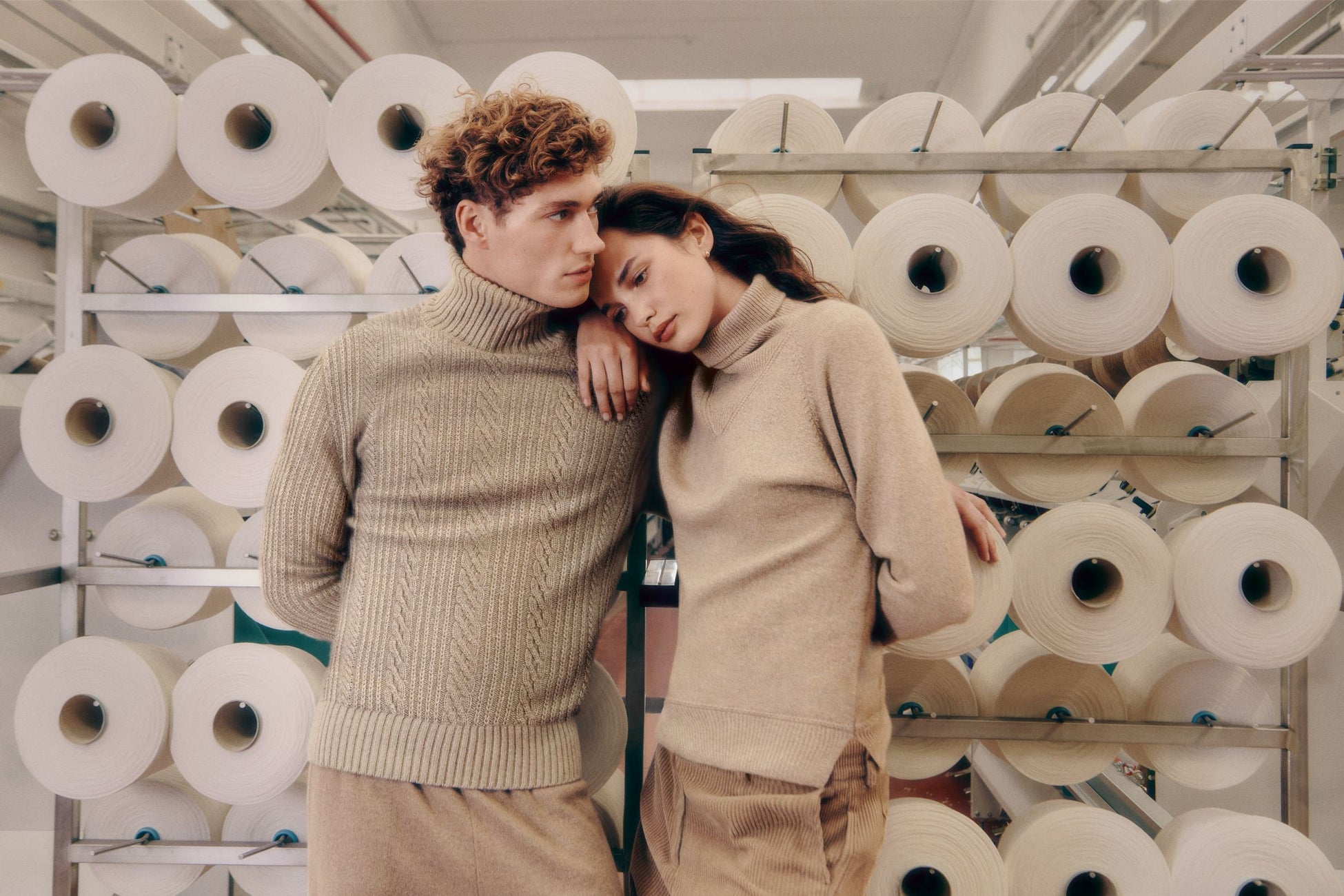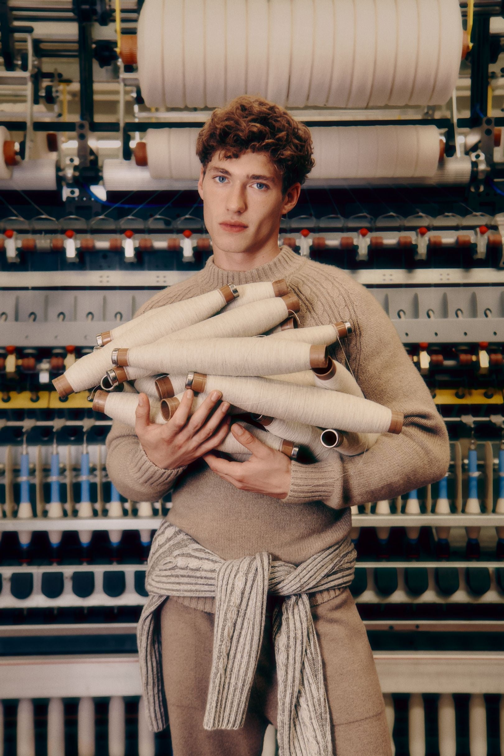 今回のキャンペーンビジュアルでは、二人のモデルが糸巻き(spools)やステープルヤーンと機械の間を軽やかに、まるで踊るように移動する様子が描かれ、観る者をファクトリーの魅惑的な世界へと誘います。そこではカシミヤがステープルファイバーから糸へ、そして最終的に衣服へと変容し、自然の営みとファルコネーリスタイルに沿って身にまとう準備が整うのです。
