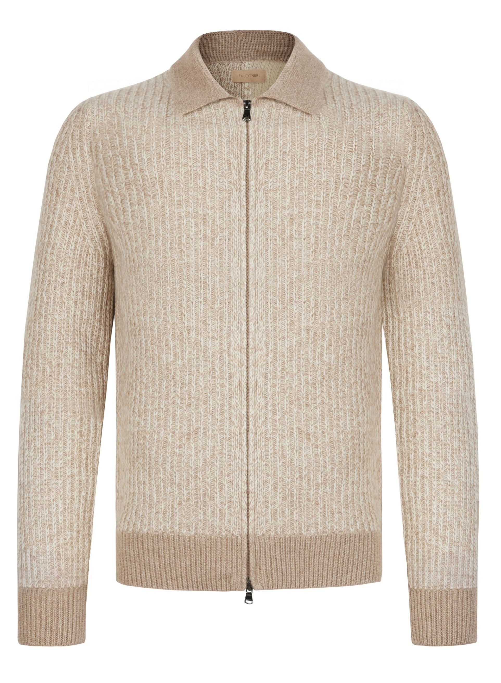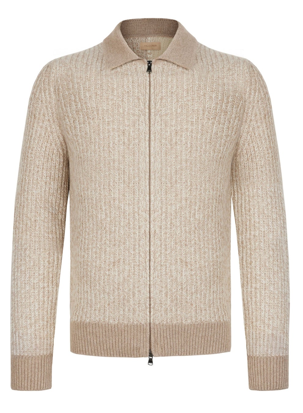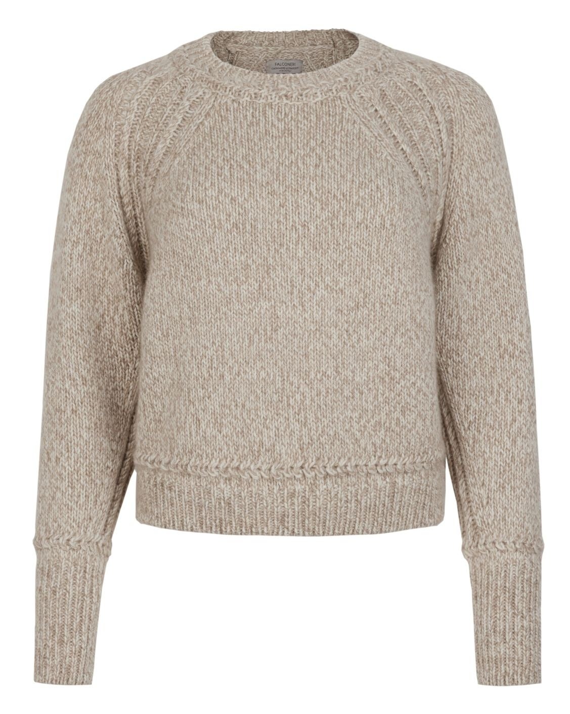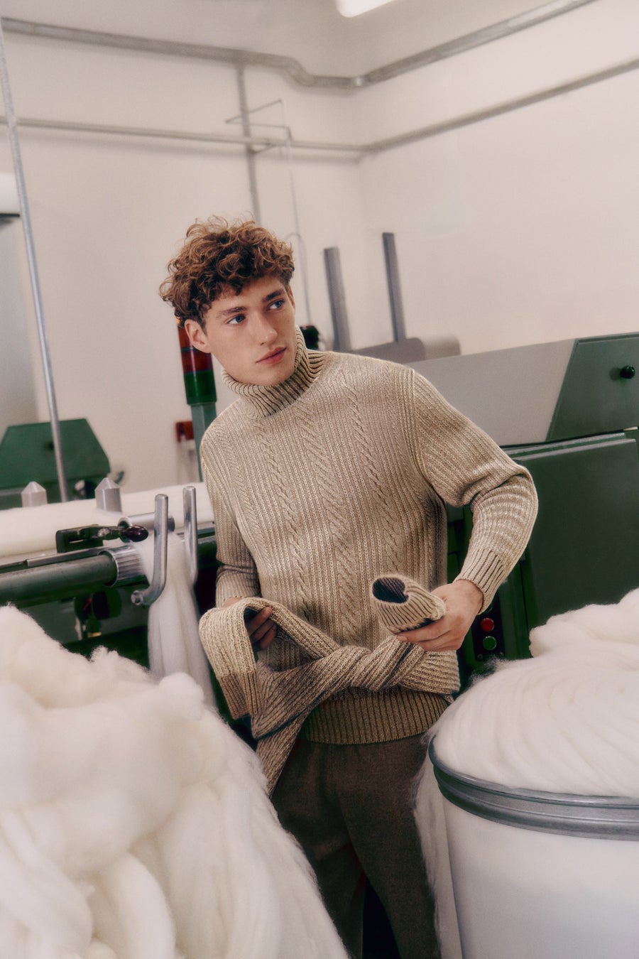 更にこのラインに加え、ファルコネーリのラインアップは、新色のトルトラ(Tortora)とフォンデンテ(Fondente)を用いた象徴的なウルトラソフトカシミヤとウルトラファインカシミヤの糸によってさらに充実し、洗練されたラインと精巧な仕上がりのアイテムを生み出しています。また、新しい型として、「オールドイングランド」ケーブルニットセーターが登場し、職人技と、唯一無二のものとする質感とディテールの追求が継続されていることを示しています。