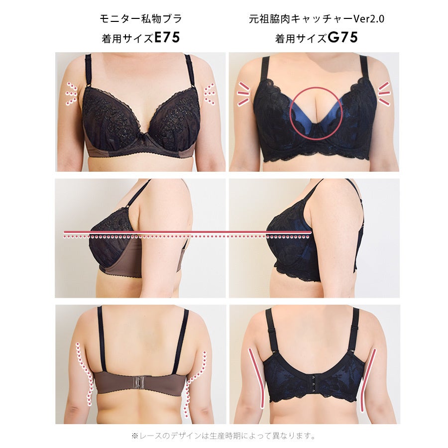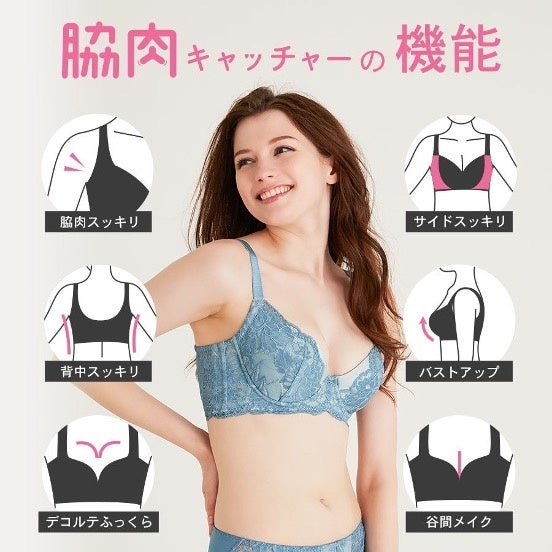 年齢とともに大きく変化する女性のからだ。なかでもバストの垂れやしぼみは、大きな悩みのひとつです。「脇肉キャッチャー®」シリーズは、そんな変化しつづける女性のバストを支えるために開発。10年以上にわたり愛され続けている機能性ブラジャー。シリーズNo.1の補整力を誇る「元祖脇肉キャッチャー®Ver2.0」は「はみ出したお肉がすべてバストに集まる!」と大変好評です。