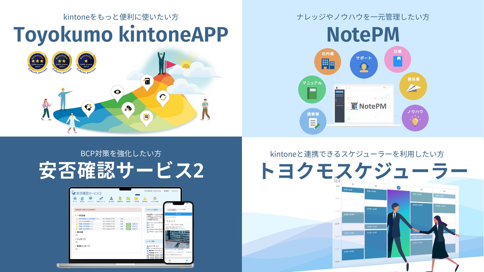 「安否確認サービス2」やサイボウズ社の「kintone」に連携するクラウドサービス、日程調整が簡単にできる「トヨクモ スケジューラー」、社内ナレッジやノウハウを一元管理できるサービス「NotePM」などの提供を行っております。