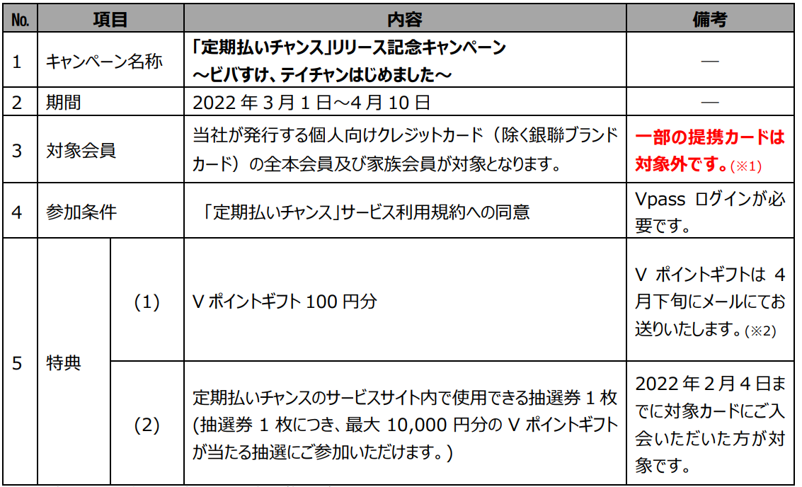 「定期払いチャンス」のサービスリリースを記念して、期間中にサービスをご利用いただくと、もれなくVポイントギフト100円分と定期払いチャンスのサービスサイト内で使える抽選券1枚をお受け取りいただけるキャンペーンを実施します。キャンペーンの適用条件・特典内容の詳細はホームページをご確認ください。